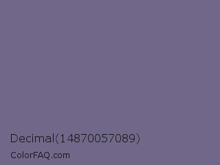 Decimal 14870057089 Color is a normal indigo color and the nearest color is Rum #796989. Hex code #716889 and RGB value is rgb(113,104,137). In RGB color space, this color is composed of 44% red, 41% green, 54% blue, In CMYK color space, this color is composed of 18% cyan, 24% magenta, 0% yellow , 46% black , In HSL color space, this color has a hue angle of 256° , 14% saturation and 47% lightness.