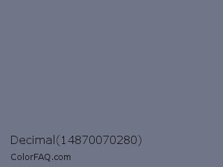 Decimal 14870070280 Color is a normal blue color and the nearest color is Storm Gray #717486. Hex code #717588 and RGB value is rgb(113,117,136). In RGB color space, this color is composed of 44% red, 46% green, 53% blue, In CMYK color space, this color is composed of 17% cyan, 14% magenta, 0% yellow , 47% black , In HSL color space, this color has a hue angle of 230° , 9% saturation and 49% lightness.