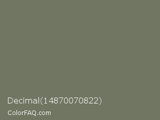Decimal 14870070822 Color is a normal lime color and the nearest color is Limed Ash #747d63. Hex code #717662 and RGB value is rgb(113,118,98). In RGB color space, this color is composed of 44% red, 46% green, 38% blue, In CMYK color space, this color is composed of 4% cyan, 0% magenta, 17% yellow , 54% black , In HSL color space, this color has a hue angle of 75° , 9% saturation and 42% lightness.