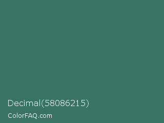 Decimal 58086215 Color is a normal green color and the nearest color is Amazon #3b7a57. Hex code #397463 and RGB value is rgb(57,116,99). In RGB color space, this color is composed of 22% red, 45% green, 39% blue, In CMYK color space, this color is composed of 51% cyan, 0% magenta, 15% yellow , 55% black , In HSL color space, this color has a hue angle of 163° , 34% saturation and 34% lightness.