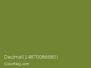 Decimal 14870086680 Color is a normal lime color and the nearest color is Wasabi #788a25. Hex code #718532 and RGB value is rgb(113,133,50). In RGB color space, this color is composed of 44% red, 52% green, 20% blue, In CMYK color space, this color is composed of 15% cyan, 0% magenta, 62% yellow , 48% black , In HSL color space, this color has a hue angle of 74° , 45% saturation and 36% lightness.