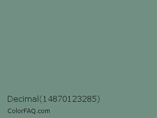 Decimal 14870123285 Color is a normal green color and the nearest color is Blue Smoke #748881. Hex code #719083 and RGB value is rgb(113,144,131). In RGB color space, this color is composed of 44% red, 56% green, 51% blue, In CMYK color space, this color is composed of 22% cyan, 0% magenta, 9% yellow , 44% black , In HSL color space, this color has a hue angle of 155° , 12% saturation and 50% lightness.