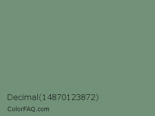 Decimal 14870123872 Color is a normal green color and the nearest color is Laurel #749378. Hex code #719178 and RGB value is rgb(113,145,120). In RGB color space, this color is composed of 44% red, 57% green, 47% blue, In CMYK color space, this color is composed of 22% cyan, 0% magenta, 17% yellow , 43% black , In HSL color space, this color has a hue angle of 133° , 13% saturation and 51% lightness.