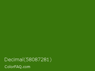 Decimal 58087281 Color is a dark green color and the nearest color is Bilbao #327c14. Hex code #39760b and RGB value is rgb(57,118,11). In RGB color space, this color is composed of 22% red, 46% green, 4% blue, In CMYK color space, this color is composed of 52% cyan, 0% magenta, 91% yellow , 54% black , In HSL color space, this color has a hue angle of 94° , 83% saturation and 25% lightness.