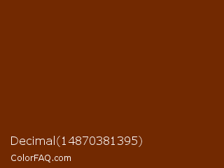 Decimal 14870381395 Color is a dark orange color and the nearest color is Cedar Wood Finish #711a00. Hex code #722901 and RGB value is rgb(114,41,1). In RGB color space, this color is composed of 45% red, 16% green, 0% blue, In CMYK color space, this color is composed of 0% cyan, 64% magenta, 99% yellow , 55% black , In HSL color space, this color has a hue angle of 21° , 98% saturation and 23% lightness.