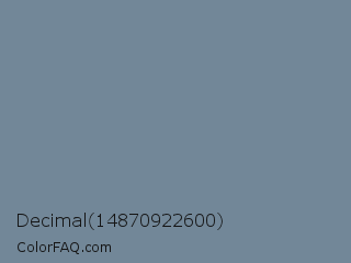 Decimal 14870922600 Color is a normal blue color and the nearest color is Light Slate Gray #778899. Hex code #728798 and RGB value is rgb(114,135,152). In RGB color space, this color is composed of 45% red, 53% green, 60% blue, In CMYK color space, this color is composed of 25% cyan, 11% magenta, 0% yellow , 40% black , In HSL color space, this color has a hue angle of 207° , 16% saturation and 52% lightness.