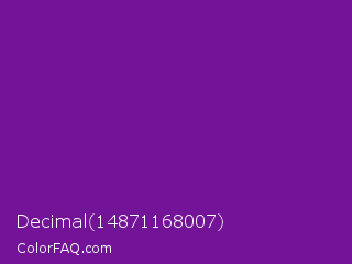 Decimal 14871168007 Color is a normal purple color and the nearest color is Seance #731e8f. Hex code #731397 and RGB value is rgb(115,19,151). In RGB color space, this color is composed of 45% red, 7% green, 59% blue, In CMYK color space, this color is composed of 24% cyan, 87% magenta, 0% yellow , 41% black , In HSL color space, this color has a hue angle of 284° , 78% saturation and 33% lightness.