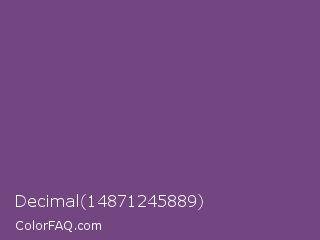 Decimal 14871245889 Color is a normal purple color and the nearest color is Affair #714693. Hex code #734681 and RGB value is rgb(115,70,129). In RGB color space, this color is composed of 45% red, 27% green, 51% blue, In CMYK color space, this color is composed of 11% cyan, 46% magenta, 0% yellow , 49% black , In HSL color space, this color has a hue angle of 286° , 30% saturation and 39% lightness.