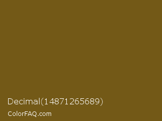 Decimal 14871265689 Color is a dark orange color and the nearest color is Himalaya #6a5d1b. Hex code #735917 and RGB value is rgb(115,89,23). In RGB color space, this color is composed of 45% red, 35% green, 9% blue, In CMYK color space, this color is composed of 0% cyan, 23% magenta, 80% yellow , 55% black , In HSL color space, this color has a hue angle of 43° , 67% saturation and 27% lightness.