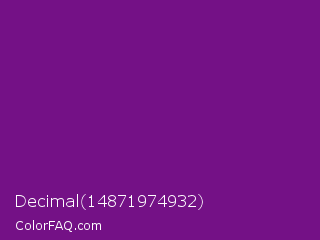 Decimal 14871974932 Color is a dark purple color and the nearest color is Seance #731e8f. Hex code #741186 and RGB value is rgb(116,17,134). In RGB color space, this color is composed of 45% red, 7% green, 53% blue, In CMYK color space, this color is composed of 13% cyan, 87% magenta, 0% yellow , 47% black , In HSL color space, this color has a hue angle of 291° , 77% saturation and 30% lightness.