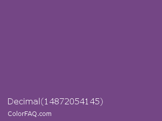 Decimal 14872054145 Color is a normal purple color and the nearest color is Affair #714693. Hex code #744685 and RGB value is rgb(116,70,133). In RGB color space, this color is composed of 45% red, 27% green, 52% blue, In CMYK color space, this color is composed of 13% cyan, 47% magenta, 0% yellow , 48% black , In HSL color space, this color has a hue angle of 284° , 31% saturation and 40% lightness.
