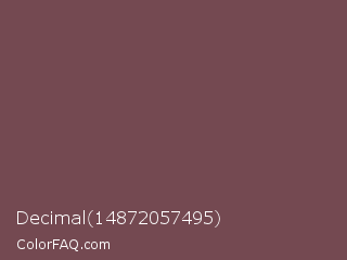 Decimal 14872057495 Color is a normal red color and the nearest color is Ferra #704f50. Hex code #744951 and RGB value is rgb(116,73,81). In RGB color space, this color is composed of 45% red, 29% green, 32% blue, In CMYK color space, this color is composed of 0% cyan, 37% magenta, 30% yellow , 55% black , In HSL color space, this color has a hue angle of 349° , 23% saturation and 37% lightness.