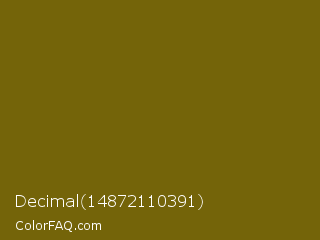 Decimal 14872110391 Color is a dark yellow color and the nearest color is Spicy Mustard #74640d. Hex code #746409 and RGB value is rgb(116,100,9). In RGB color space, this color is composed of 45% red, 39% green, 4% blue, In CMYK color space, this color is composed of 0% cyan, 14% magenta, 92% yellow , 55% black , In HSL color space, this color has a hue angle of 51° , 86% saturation and 25% lightness.