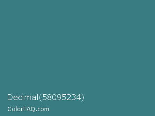 Decimal 58095234 Color is a normal cyan color and the nearest color is Paradiso #317d82. Hex code #397d82 and RGB value is rgb(57,125,130). In RGB color space, this color is composed of 22% red, 49% green, 51% blue, In CMYK color space, this color is composed of 56% cyan, 4% magenta, 0% yellow , 49% black , In HSL color space, this color has a hue angle of 184° , 39% saturation and 37% lightness.