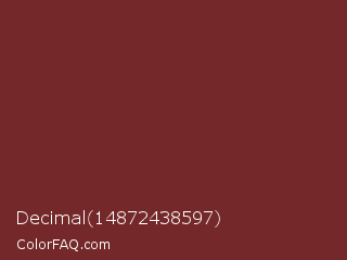 Decimal 14872438597 Color is a normal red color and the nearest color is Metallic Copper #71291d. Hex code #752829 and RGB value is rgb(117,40,41). In RGB color space, this color is composed of 46% red, 16% green, 16% blue, In CMYK color space, this color is composed of 0% cyan, 66% magenta, 65% yellow , 54% black , In HSL color space, this color has a hue angle of 359° , 49% saturation and 31% lightness.