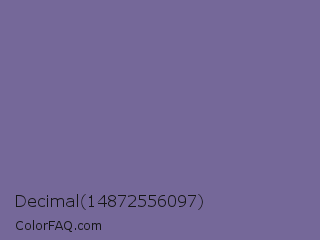 Decimal 14872556097 Color is a normal indigo color and the nearest color is Kimberly #736c9f. Hex code #756899 and RGB value is rgb(117,104,153). In RGB color space, this color is composed of 46% red, 41% green, 60% blue, In CMYK color space, this color is composed of 24% cyan, 32% magenta, 0% yellow , 40% black , In HSL color space, this color has a hue angle of 256° , 19% saturation and 50% lightness.