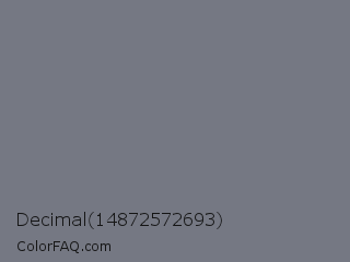 Decimal 14872572693 Color is a normal blue color and the nearest color is Rolling Stone #747d83. Hex code #757883 and RGB value is rgb(117,120,131). In RGB color space, this color is composed of 46% red, 47% green, 51% blue, In CMYK color space, this color is composed of 11% cyan, 8% magenta, 0% yellow , 49% black , In HSL color space, this color has a hue angle of 227° , 6% saturation and 49% lightness.