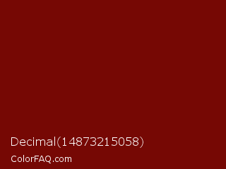 Decimal 14873215058 Color is a dark red color and the nearest color is Barn Red #7c0a02. Hex code #760804 and RGB value is rgb(118,8,4). In RGB color space, this color is composed of 46% red, 3% green, 2% blue, In CMYK color space, this color is composed of 0% cyan, 93% magenta, 97% yellow , 54% black , In HSL color space, this color has a hue angle of 2° , 93% saturation and 24% lightness.