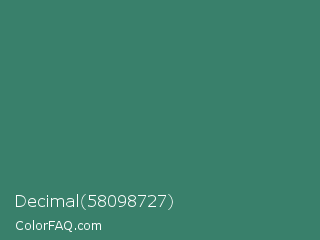 Decimal 58098727 Color is a normal green color and the nearest color is Viridian #40826d. Hex code #39806b and RGB value is rgb(57,128,107). In RGB color space, this color is composed of 22% red, 50% green, 42% blue, In CMYK color space, this color is composed of 55% cyan, 0% magenta, 16% yellow , 50% black , In HSL color space, this color has a hue angle of 162° , 38% saturation and 36% lightness.