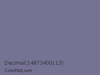 Decimal 14873400113 Color is a normal indigo color and the nearest color is Rhythm #777696. Hex code #767293 and RGB value is rgb(118,114,147). In RGB color space, this color is composed of 46% red, 45% green, 58% blue, In CMYK color space, this color is composed of 20% cyan, 22% magenta, 0% yellow , 42% black , In HSL color space, this color has a hue angle of 247° , 13% saturation and 51% lightness.