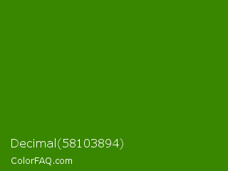 Decimal 58103894 Color is a dark green color and the nearest color is Napier Green #2a8000. Hex code #398600 and RGB value is rgb(57,134,0). In RGB color space, this color is composed of 22% red, 53% green, 0% blue, In CMYK color space, this color is composed of 57% cyan, 0% magenta, 100% yellow , 47% black , In HSL color space, this color has a hue angle of 94° , 100% saturation and 26% lightness.