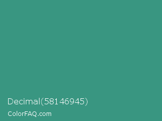 Decimal 58146945 Color is a normal cyan color and the nearest color is Illuminating Emerald #319177. Hex code #399681 and RGB value is rgb(57,150,129). In RGB color space, this color is composed of 22% red, 59% green, 51% blue, In CMYK color space, this color is composed of 62% cyan, 0% magenta, 14% yellow , 41% black , In HSL color space, this color has a hue angle of 166° , 45% saturation and 41% lightness.