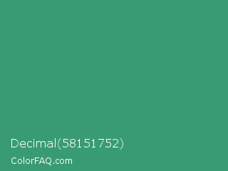Decimal 58151752 Color is a normal green color and the nearest color is Illuminating Emerald #319177. Hex code #399b74 and RGB value is rgb(57,155,116). In RGB color space, this color is composed of 22% red, 61% green, 45% blue, In CMYK color space, this color is composed of 63% cyan, 0% magenta, 25% yellow , 39% black , In HSL color space, this color has a hue angle of 156° , 46% saturation and 42% lightness.