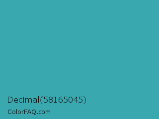 Decimal 58165045 Color is a normal cyan color and the nearest color is Verdigris #43b3ae. Hex code #39a8af and RGB value is rgb(57,168,175). In RGB color space, this color is composed of 22% red, 66% green, 69% blue, In CMYK color space, this color is composed of 67% cyan, 4% magenta, 0% yellow , 31% black , In HSL color space, this color has a hue angle of 184° , 51% saturation and 45% lightness.