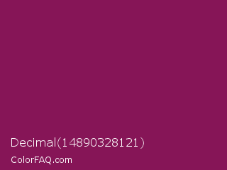 Decimal 14890328121 Color is a dark magenta color and the nearest color is French Plum #811453. Hex code #861557 and RGB value is rgb(134,21,87). In RGB color space, this color is composed of 53% red, 8% green, 34% blue, In CMYK color space, this color is composed of 0% cyan, 84% magenta, 35% yellow , 47% black , In HSL color space, this color has a hue angle of 325° , 73% saturation and 30% lightness.