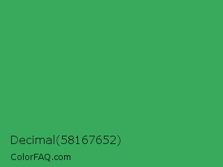 Decimal 58167652 Color is a normal green color and the nearest color is Chateau Green #40a860. Hex code #39aa5c and RGB value is rgb(57,170,92). In RGB color space, this color is composed of 22% red, 67% green, 36% blue, In CMYK color space, this color is composed of 66% cyan, 0% magenta, 46% yellow , 33% black , In HSL color space, this color has a hue angle of 139° , 50% saturation and 45% lightness.