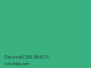 Decimal 58198419 Color is a normal green color and the nearest color is Mint #3eb489. Hex code #39b181 and RGB value is rgb(57,177,129). In RGB color space, this color is composed of 22% red, 69% green, 51% blue, In CMYK color space, this color is composed of 68% cyan, 0% magenta, 27% yellow , 31% black , In HSL color space, this color has a hue angle of 156° , 51% saturation and 46% lightness.