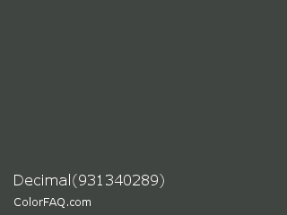 Decimal 931340289 Color is a dark green color and the nearest color is Cape Cod #3c4443. Hex code #414541 and RGB value is rgb(65,69,65). In RGB color space, this color is composed of 25% red, 27% green, 25% blue, In CMYK color space, this color is composed of 6% cyan, 0% magenta, 6% yellow , 73% black , In HSL color space, this color has a hue angle of 120° , 3% saturation and 26% lightness.