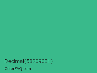 Decimal 58209031 Color is a normal green color and the nearest color is Mint #3eb489. Hex code #39ba8b and RGB value is rgb(57,186,139). In RGB color space, this color is composed of 22% red, 73% green, 55% blue, In CMYK color space, this color is composed of 69% cyan, 0% magenta, 25% yellow , 27% black , In HSL color space, this color has a hue angle of 158° , 53% saturation and 48% lightness.