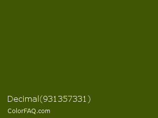Decimal 931357331 Color is a very dark lime color and the nearest color is Verdun Green #495400. Hex code #415605 and RGB value is rgb(65,86,5). In RGB color space, this color is composed of 25% red, 34% green, 2% blue, In CMYK color space, this color is composed of 24% cyan, 0% magenta, 94% yellow , 66% black , In HSL color space, this color has a hue angle of 76° , 89% saturation and 18% lightness.