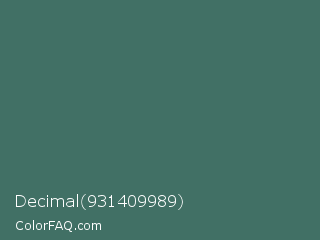Decimal 931409989 Color is a normal cyan color and the nearest color is William #3a686c. Hex code #417065 and RGB value is rgb(65,112,101). In RGB color space, this color is composed of 25% red, 44% green, 40% blue, In CMYK color space, this color is composed of 42% cyan, 0% magenta, 10% yellow , 56% black , In HSL color space, this color has a hue angle of 166° , 27% saturation and 35% lightness.
