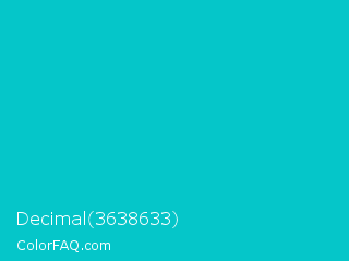 Decimal 3638633 Color is a normal cyan color and the nearest color is Turquoise Surf #00c5cd. Hex code #05c6c9 and RGB value is rgb(5,198,201). In RGB color space, this color is composed of 2% red, 78% green, 79% blue, In CMYK color space, this color is composed of 98% cyan, 1% magenta, 0% yellow , 21% black , In HSL color space, this color has a hue angle of 181° , 95% saturation and 40% lightness.