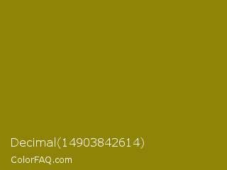 Decimal 14903842614 Color is a dark yellow color and the nearest color is Dark Yellow #9b870c. Hex code #908408 and RGB value is rgb(144,132,8). In RGB color space, this color is composed of 56% red, 52% green, 3% blue, In CMYK color space, this color is composed of 0% cyan, 8% magenta, 94% yellow , 44% black , In HSL color space, this color has a hue angle of 55° , 89% saturation and 30% lightness.