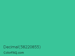 Decimal 58220855 Color is a normal green color and the nearest color is Shamrock #33cc99. Hex code #39c599 and RGB value is rgb(57,197,153). In RGB color space, this color is composed of 22% red, 77% green, 60% blue, In CMYK color space, this color is composed of 71% cyan, 0% magenta, 22% yellow , 23% black , In HSL color space, this color has a hue angle of 161° , 55% saturation and 50% lightness.