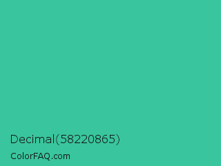 Decimal 58220865 Color is a normal green color and the nearest color is Shamrock #33cc99. Hex code #39c59d and RGB value is rgb(57,197,157). In RGB color space, this color is composed of 22% red, 77% green, 62% blue, In CMYK color space, this color is composed of 71% cyan, 0% magenta, 20% yellow , 23% black , In HSL color space, this color has a hue angle of 163° , 55% saturation and 50% lightness.