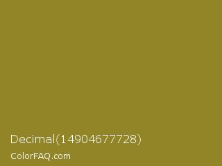 Decimal 14904677728 Color is a normal yellow color and the nearest color is Hacienda #98811b. Hex code #918528 and RGB value is rgb(145,133,40). In RGB color space, this color is composed of 57% red, 52% green, 16% blue, In CMYK color space, this color is composed of 0% cyan, 8% magenta, 72% yellow , 43% black , In HSL color space, this color has a hue angle of 53° , 57% saturation and 36% lightness.