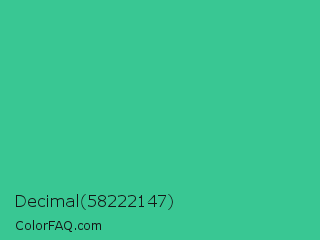 Decimal 58222147 Color is a normal green color and the nearest color is Shamrock #33cc99. Hex code #39c793 and RGB value is rgb(57,199,147). In RGB color space, this color is composed of 22% red, 78% green, 58% blue, In CMYK color space, this color is composed of 71% cyan, 0% magenta, 26% yellow , 22% black , In HSL color space, this color has a hue angle of 158° , 56% saturation and 50% lightness.