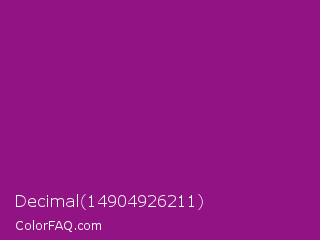 Decimal 14904926211 Color is a normal magenta color and the nearest color is Mardi Gras #880085. Hex code #921383 and RGB value is rgb(146,19,131). In RGB color space, this color is composed of 57% red, 7% green, 51% blue, In CMYK color space, this color is composed of 0% cyan, 87% magenta, 10% yellow , 43% black , In HSL color space, this color has a hue angle of 307° , 77% saturation and 32% lightness.