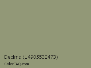 Decimal 14905532473 Color is a normal lime color and the nearest color is Artichoke #8f9779. Hex code #929877 and RGB value is rgb(146,152,119). In RGB color space, this color is composed of 57% red, 60% green, 47% blue, In CMYK color space, this color is composed of 4% cyan, 0% magenta, 22% yellow , 40% black , In HSL color space, this color has a hue angle of 71° , 14% saturation and 53% lightness.