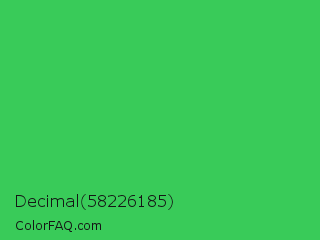 Decimal 58226185 Color is a normal green color and the nearest color is UFO Green #3cd070. Hex code #39cb59 and RGB value is rgb(57,203,89). In RGB color space, this color is composed of 22% red, 80% green, 35% blue, In CMYK color space, this color is composed of 72% cyan, 0% magenta, 56% yellow , 20% black , In HSL color space, this color has a hue angle of 133° , 58% saturation and 51% lightness.