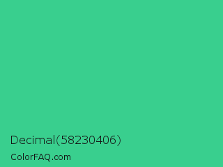 Decimal 58230406 Color is a normal green color and the nearest color is Shamrock #33cc99. Hex code #39cf8e and RGB value is rgb(57,207,142). In RGB color space, this color is composed of 22% red, 81% green, 56% blue, In CMYK color space, this color is composed of 72% cyan, 0% magenta, 31% yellow , 19% black , In HSL color space, this color has a hue angle of 154° , 61% saturation and 52% lightness.
