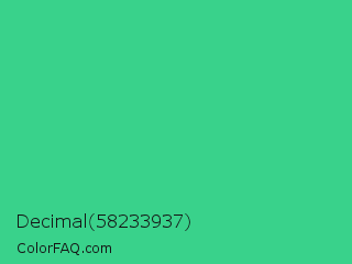 Decimal 58233937 Color is a normal green color and the nearest color is Shamrock #33cc99. Hex code #39d28b and RGB value is rgb(57,210,139). In RGB color space, this color is composed of 22% red, 82% green, 55% blue, In CMYK color space, this color is composed of 73% cyan, 0% magenta, 34% yellow , 18% black , In HSL color space, this color has a hue angle of 152° , 63% saturation and 52% lightness.