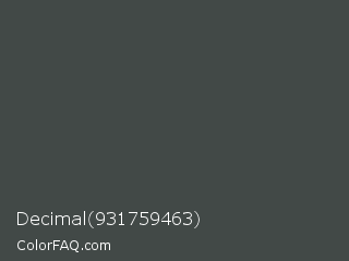 Decimal 931759463 Color is a dark green color and the nearest color is Outer Space #414a4c. Hex code #424947 and RGB value is rgb(66,73,71). In RGB color space, this color is composed of 26% red, 29% green, 28% blue, In CMYK color space, this color is composed of 10% cyan, 0% magenta, 3% yellow , 71% black , In HSL color space, this color has a hue angle of 163° , 5% saturation and 27% lightness.