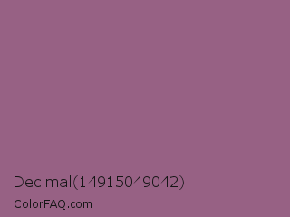 Decimal 14915049042 Color is a normal magenta color and the nearest color is Strikemaster #956387. Hex code #976184 and RGB value is rgb(151,97,132). In RGB color space, this color is composed of 59% red, 38% green, 52% blue, In CMYK color space, this color is composed of 0% cyan, 36% magenta, 13% yellow , 41% black , In HSL color space, this color has a hue angle of 321° , 22% saturation and 49% lightness.