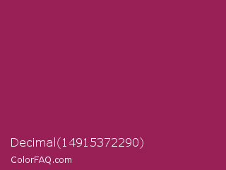 Decimal 14915372290 Color is a normal rose color and the nearest color is Dark Raspberry #872657. Hex code #982056 and RGB value is rgb(152,32,86). In RGB color space, this color is composed of 60% red, 13% green, 34% blue, In CMYK color space, this color is composed of 0% cyan, 79% magenta, 43% yellow , 40% black , In HSL color space, this color has a hue angle of 333° , 65% saturation and 36% lightness.