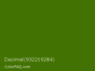 Decimal 932219284 Color is a dark green color and the nearest color is Green Leaf #436a0d. Hex code #427202 and RGB value is rgb(66,114,2). In RGB color space, this color is composed of 26% red, 45% green, 1% blue, In CMYK color space, this color is composed of 42% cyan, 0% magenta, 98% yellow , 55% black , In HSL color space, this color has a hue angle of 86° , 97% saturation and 23% lightness.